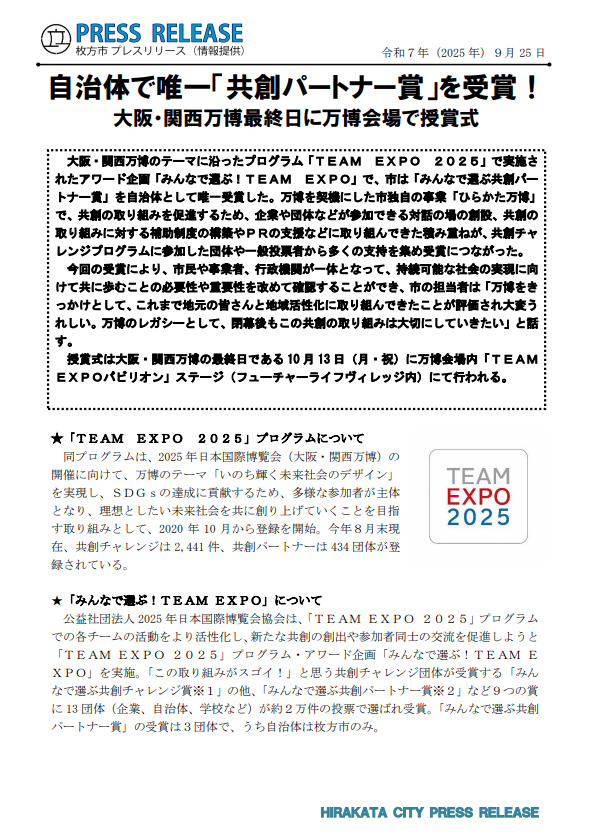 そしてこの度、この閉幕に合わせて各賞が発表されましたが、枚方市は自治体で唯一この「共創パートナー賞」を受賞することになりました。